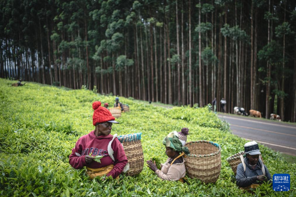 2025年4月5日,農民在肯尼亞凱里喬C22公路旁的茶田采茶。 新華社記者 王冠森 攝