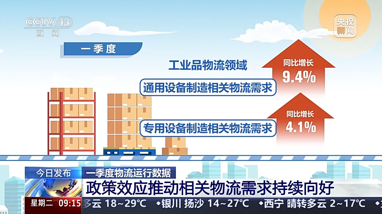 政策效應持續(xù)顯現(xiàn),大規(guī)模設備更新、消費品以舊換新政策推動相關物流需求持續(xù)向好。一季度,工業(yè)品物流領域的通用設備、專用設備制造相關物流需求,同比分別增長9.4%、4.1%;民生消費領域的通信器材類、家用電器和音像器材類、家具類商品零售相關物流需求同比分別增長26.9%、19.3%和18.1%。