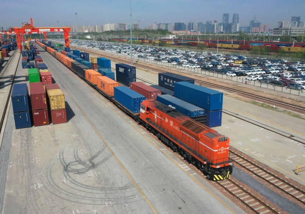 2025年4月15日,X8003次中歐班列(鄭州)??吭趪?guó)鐵集團(tuán)鄭州局圃田車站(無(wú)人機(jī)照片)。新華社記者 李嘉南 攝