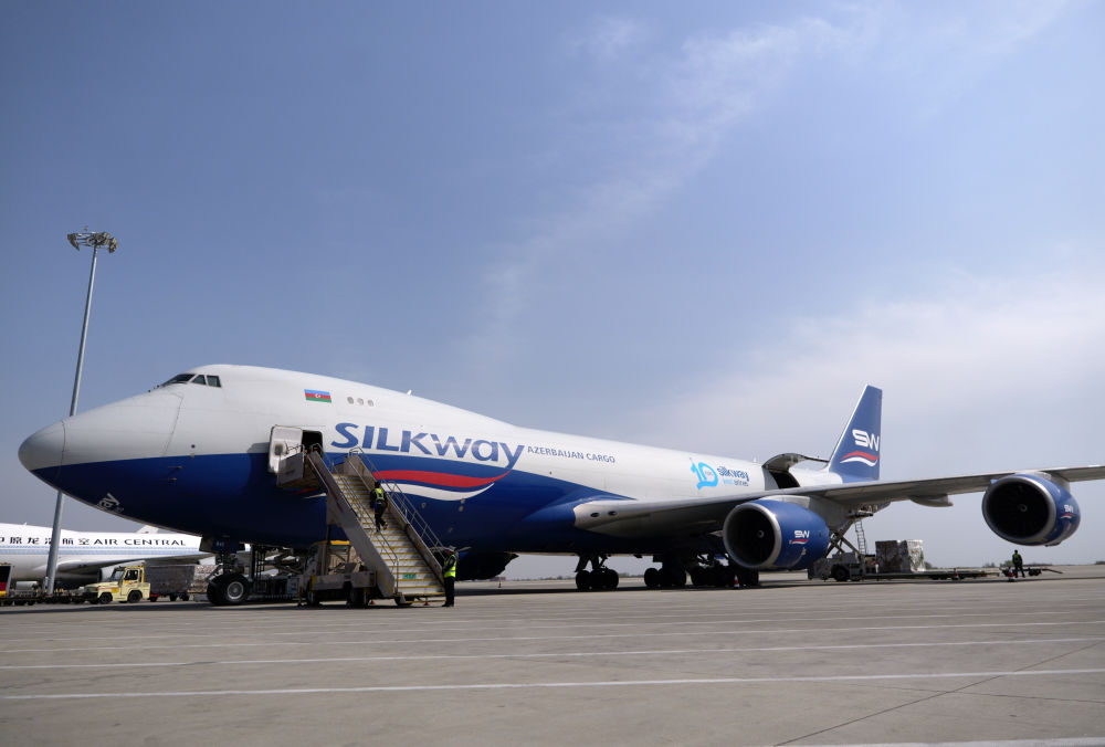 2025年4月2日,一架阿塞拜疆絲綢之路西部航空公司的貨機(jī)??吭卩嵵菪锣崌?guó)際機(jī)場(chǎng)停機(jī)坪上。新華社記者 李嘉南 攝