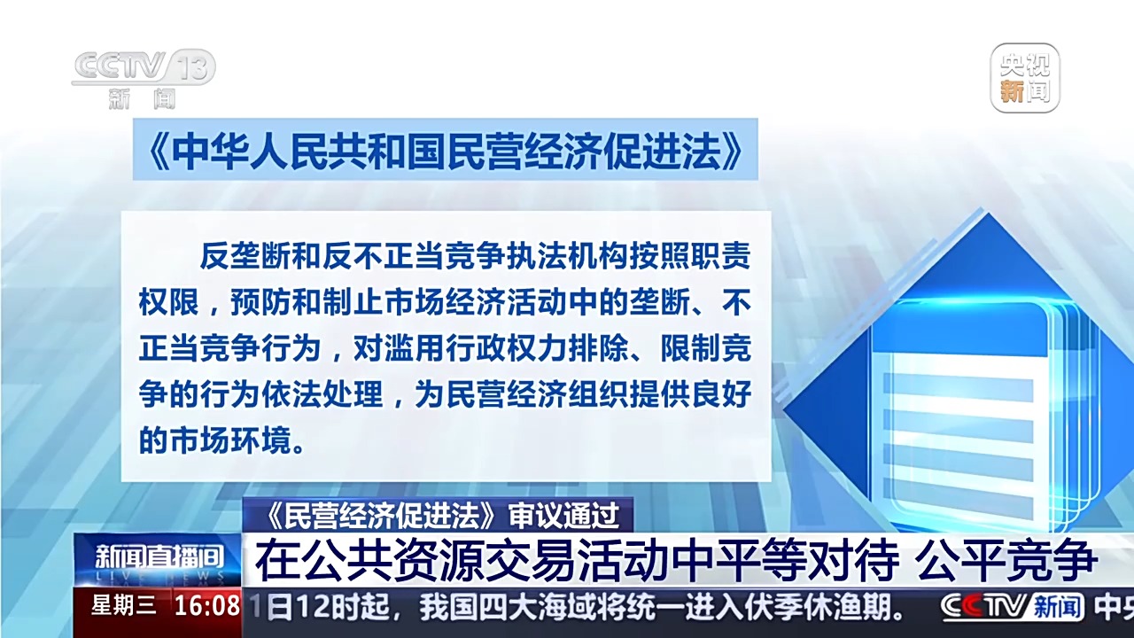 全國人大常委會(huì)法工委經(jīng)濟(jì)法室主任 楊合慶:規(guī)定市場準(zhǔn)入負(fù)面清單以外的領(lǐng)域,包括民營經(jīng)濟(jì)組織在內(nèi)的各類經(jīng)濟(jì)組織可以依法平等進(jìn)入;對(duì)落實(shí)公平競爭審查制度、定期清理市場準(zhǔn)入壁壘、禁止在公共資源交易活動(dòng)中限制或者排斥民營經(jīng)濟(jì)組織等作出規(guī)定。