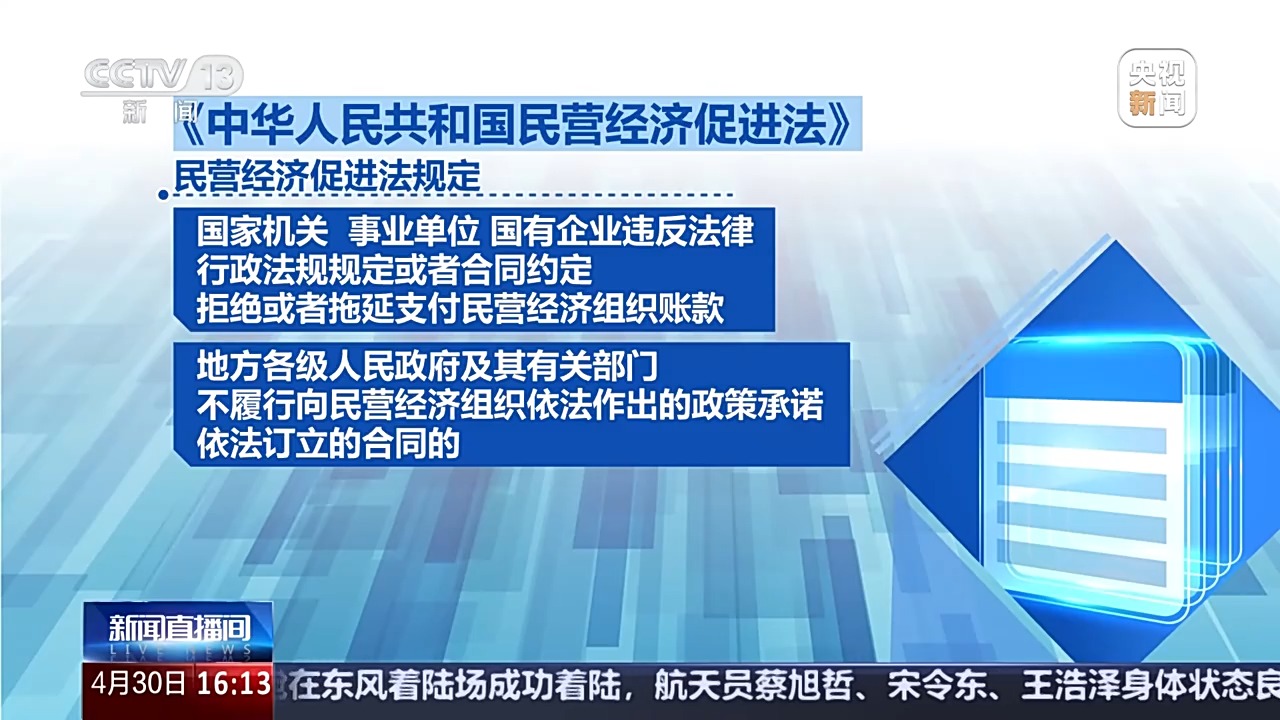 另外,民營經(jīng)濟(jì)促進(jìn)法規(guī)定,國家機(jī)關(guān)、事業(yè)單位、國有企業(yè)違反法律、行政法規(guī)規(guī)定或者合同約定,拒絕或者拖延支付民營經(jīng)濟(jì)組織賬款,地方各級(jí)人民政府及其有關(guān)部門不履行向民營經(jīng)濟(jì)組織依法作出的政策承諾、依法訂立的合同的,由有權(quán)機(jī)關(guān)予以糾正,造成損失的,依法予以賠償;造成不良后果或者影響的,對(duì)負(fù)有責(zé)任的領(lǐng)導(dǎo)人員和直接責(zé)任人員依法給予處分。