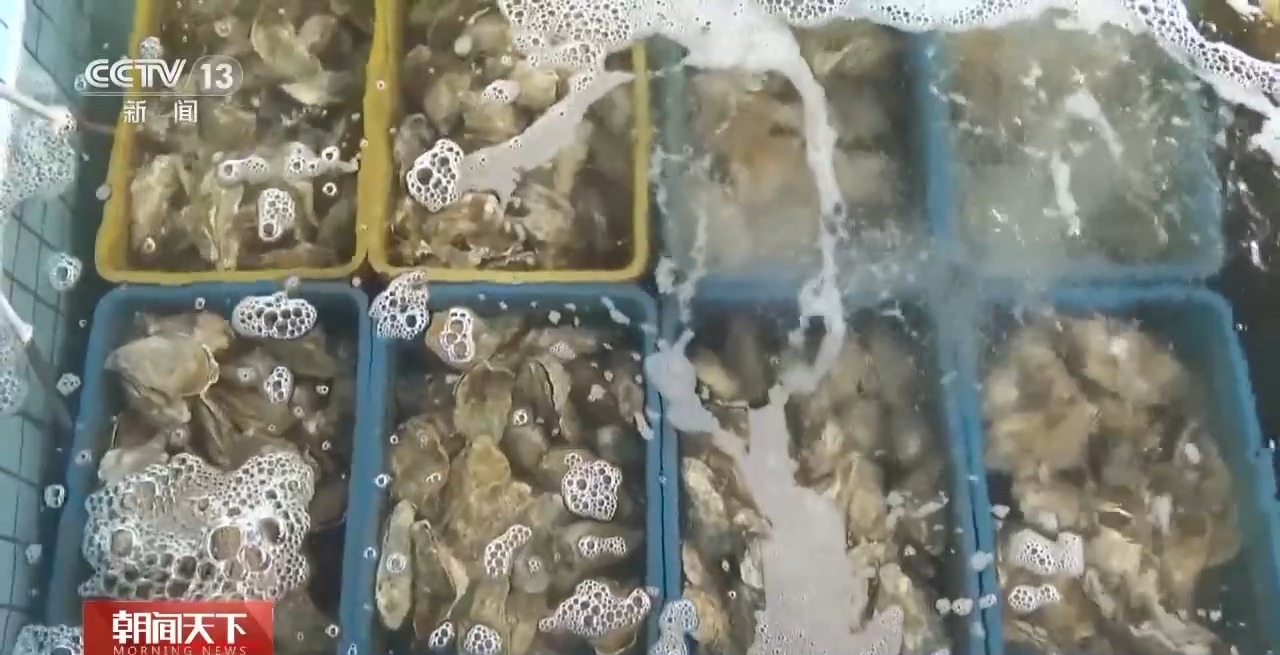總臺(tái)央視記者 李嘯虎:在國(guó)家農(nóng)業(yè)產(chǎn)業(yè)強(qiáng)鎮(zhèn)廣東陽(yáng)西程村鎮(zhèn),“五一”期間,這里的生蠔迎來(lái)大量上市。這片占地六萬(wàn)多畝的生蠔養(yǎng)殖基地里,養(yǎng)殖戶正從水下收獲一排排成熟的生蠔,40多萬(wàn)箱新捕撈的海鮮正從這里走上百姓的節(jié)日餐桌。