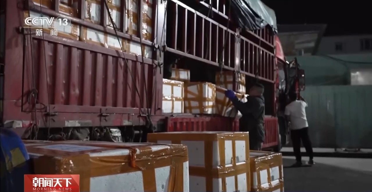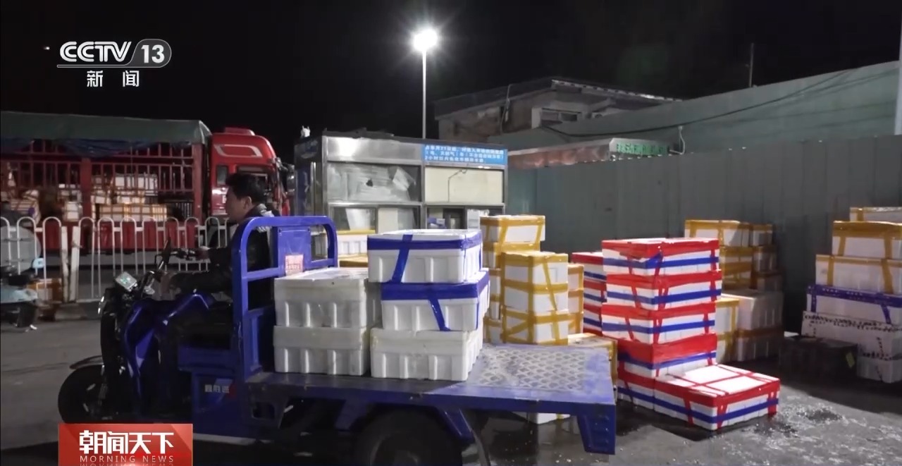 總臺(tái)央視記者 張琪:在北京大紅門京深海鮮批發(fā)市場(chǎng),凌晨2點(diǎn)半,進(jìn)場(chǎng)的車輛絡(luò)繹不絕,物流停車場(chǎng)也停滿了正在卸貨的貨車。