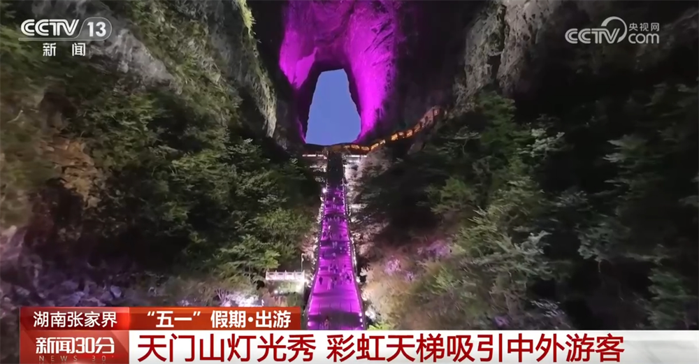 “五一”假期,湖南天門山景區(qū)以自然風(fēng)光吸引中外游客。隨著夜幕降臨,天門山山體被五彩燈光點(diǎn)亮,999級彩虹臺(tái)階燈光流轉(zhuǎn),遠(yuǎn)看就像一道連通天地的彩虹橋,將千年奇觀天門洞裝點(diǎn)得更加巍峨壯觀。
