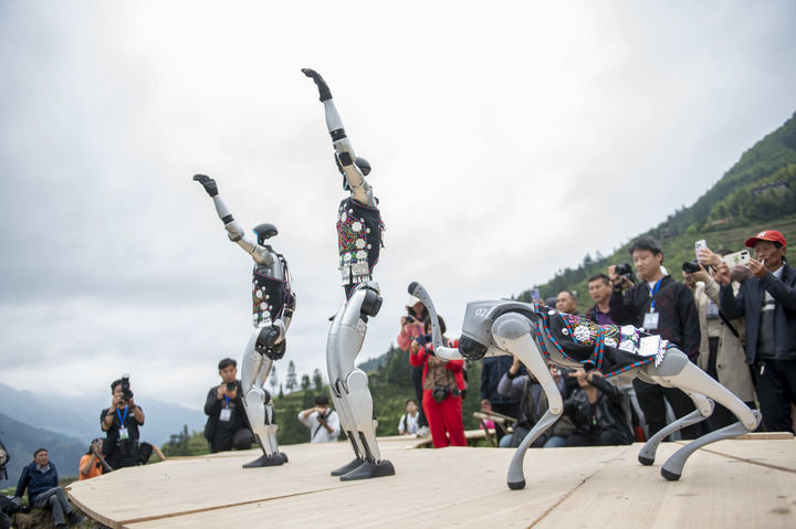 2025年4月26日,機(jī)器人在貴州省從江縣加榜梯田上參加梯田走秀活動(dòng)。