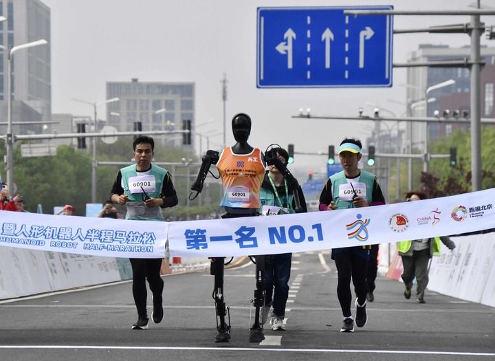 2025年4月19日,在北京亦莊舉行的2025北京亦莊半程馬拉松暨人形機(jī)器人半程馬拉松比賽上,天工隊(duì)選手天工Ultra(左二)沖向終點(diǎn)。