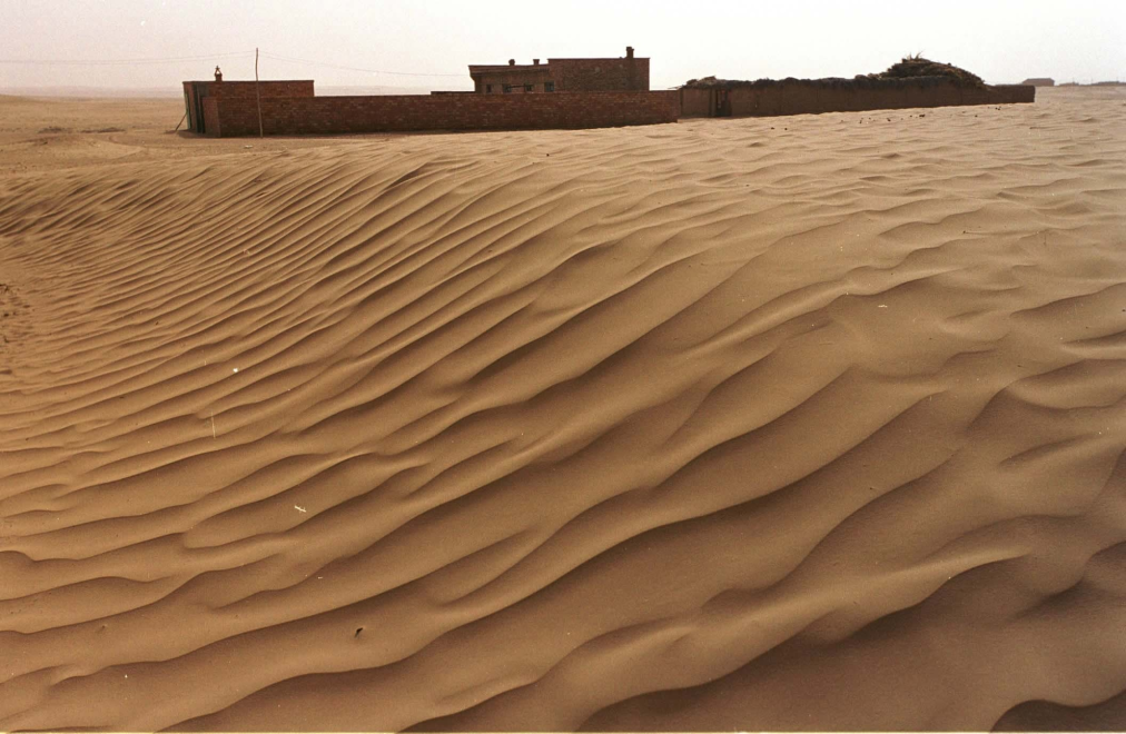 2002年拍攝的資料照片,寧夏鹽池縣馮記溝鄉(xiāng)黎明村土地沙化,村民院落被流動沙丘包圍。新華社記者 劉泉龍 攝
