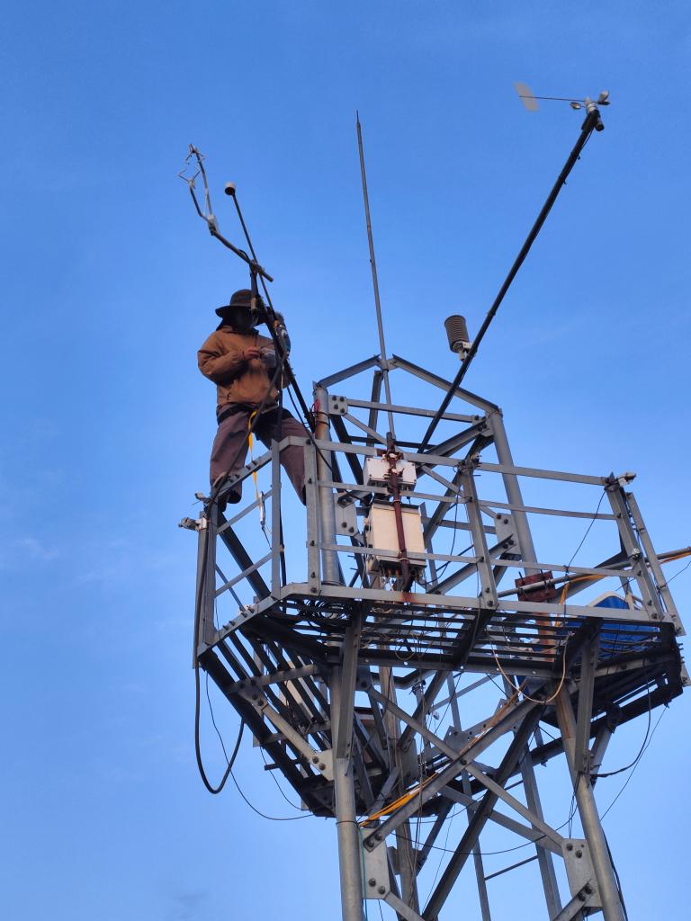 北京林業(yè)大學(xué)博士生梁琨在檢修維護(hù)通量塔。(受訪者供圖)