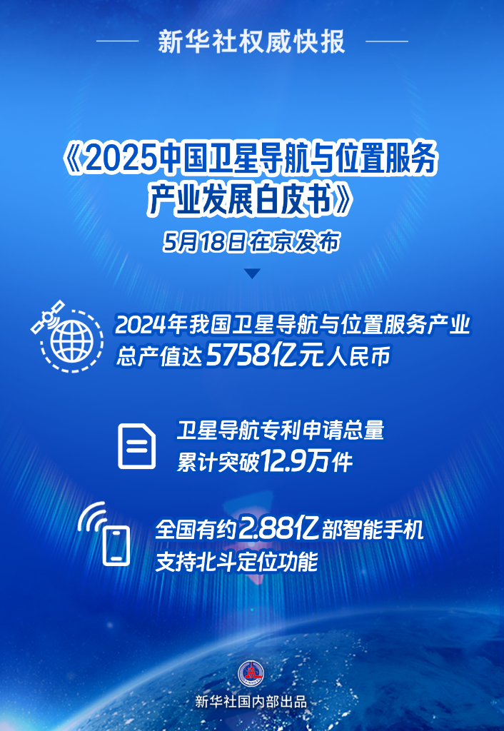5月18日在京發(fā)布的《2025中國衛(wèi)星導航與位置服務產(chǎn)業(yè)發(fā)展白皮書》顯示,2024年我國衛(wèi)星導航與位置服務產(chǎn)業(yè)總產(chǎn)值達5758億元人民幣,同比增長7.39%;衛(wèi)星導航專利申請總量累計突破12.9萬件,繼續(xù)保持全球領先……