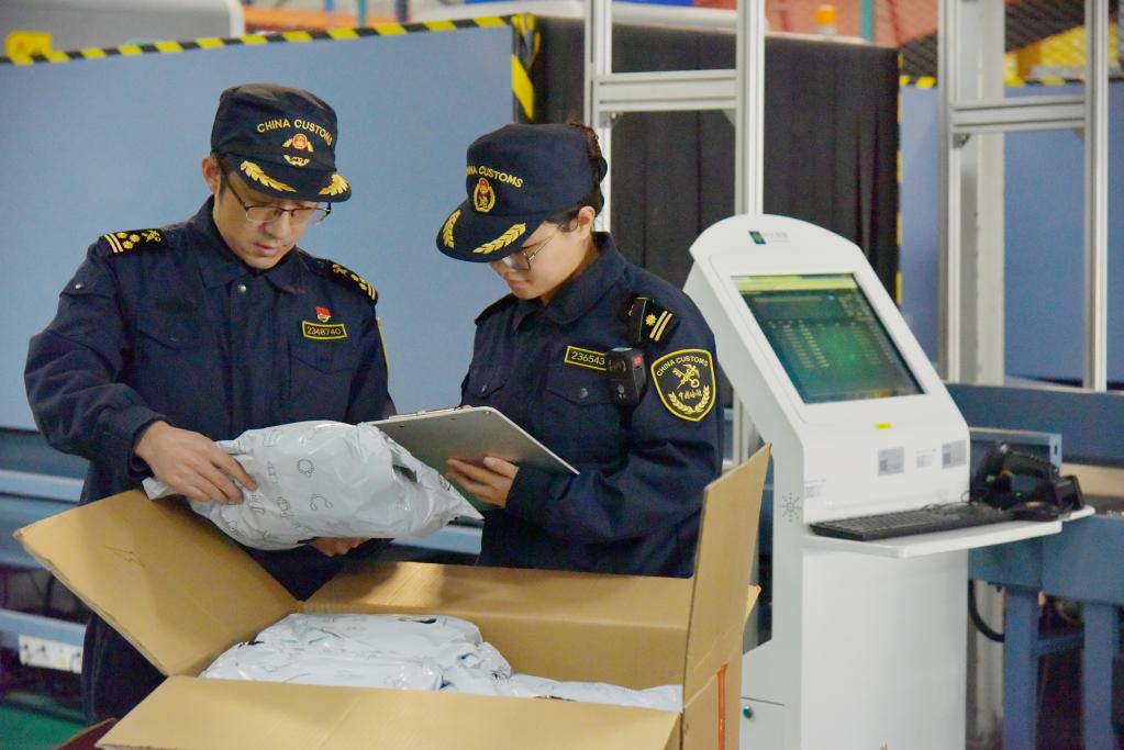 無(wú)錫海關(guān)關(guān)員對(duì)運(yùn)往墨西哥的跨境電商商品進(jìn)行查驗(yàn)(2024年12月26日攝)。新華社發(fā)