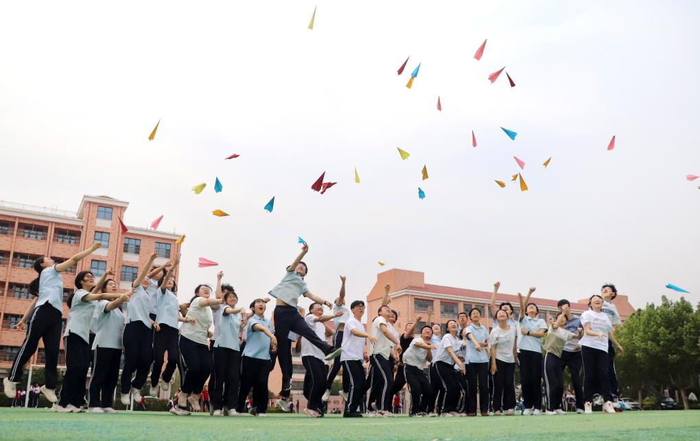 5月22日,在山東省高密市第五中學,高三學生將寫有夢想的紙飛機拋向空中。高考臨近,各地學校組織高三學生開展不同形式的減壓活動,幫助學生放松心情,迎接高考。 新華社發(fā)(李海濤攝)