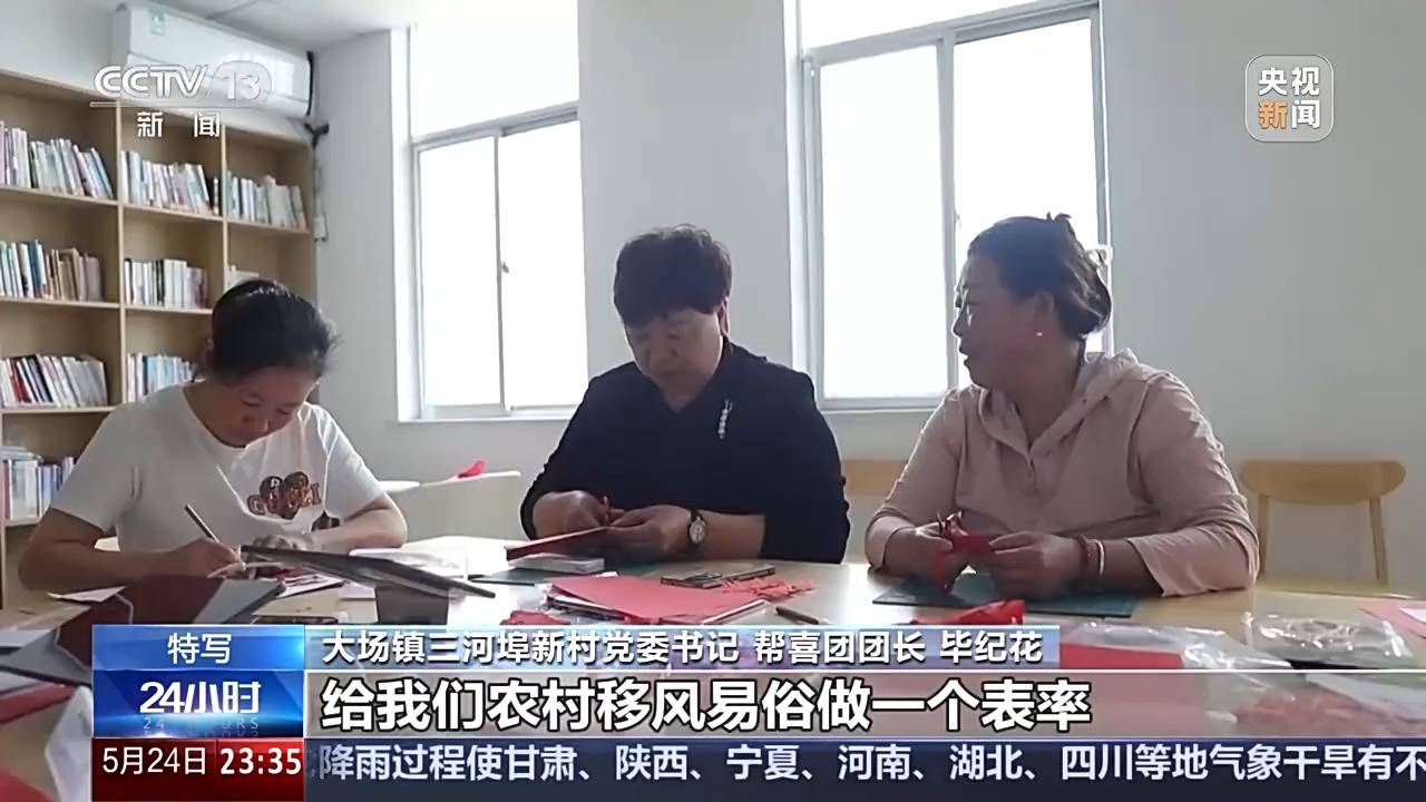 大場鎮(zhèn)三河埠新村黨委書記 幫喜團團長 畢紀花:剛開始的時候我們在一起剪紙,有一位大姐的兒子要結(jié)婚,我們當(dāng)時就給紀大姐做工作,說她完全可以成為第一個吃螃蟹的人,給我們農(nóng)村移風(fēng)易俗做一個表率。