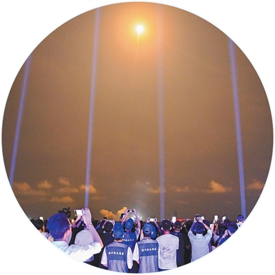 “5,4,3,2,1”——火箭的火焰照亮夜幕,平臺的光束射向天際……19時50分,火箭發(fā)射升空,游客們舉著手機記錄,現(xiàn)場歡呼聲陣陣?!昂芘d奮、很震撼,感覺一伸手就能‘抓’到火箭?!毖逾暦普f。