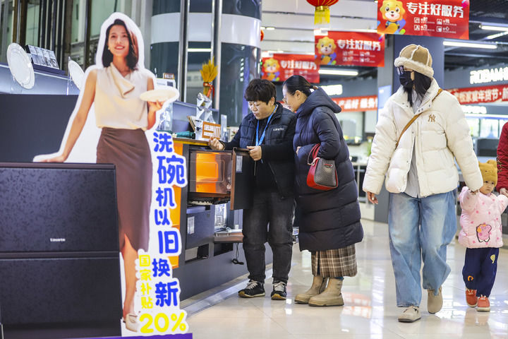 2025年1月8日,顧客在山東省青島市李滄區(qū)李村街道一家商場選購洗碗機(jī)。新華社發(fā)(張鷹 攝)