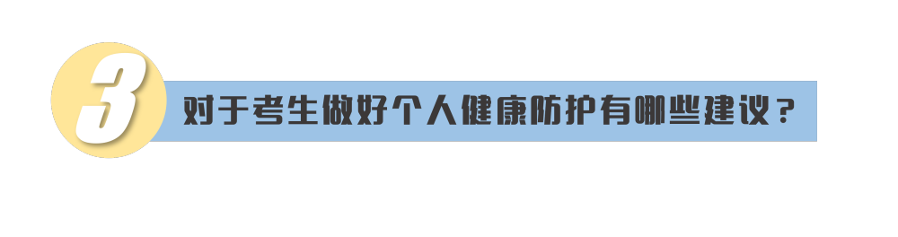 考生要做好個(gè)人防護(hù),當(dāng)好自身健康第一責(zé)任人??记氨M量減少聚集和流動(dòng),不去人員密集場(chǎng)所。同時(shí),調(diào)整好心理狀態(tài),保證合理的飲食、充足的睡眠、適當(dāng)?shù)纳眢w鍛煉,如有不適,要及時(shí)就醫(yī)治療,謹(jǐn)防因身體不適而影響考試。對(duì)于發(fā)熱或者突發(fā)急病等考生,也不必?fù)?dān)心恐慌,各地考點(diǎn)都制定了相應(yīng)的預(yù)案。