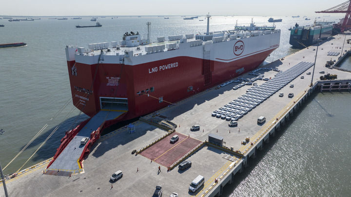 2025年4月26日,出口汽車(chē)在蘇州港太倉(cāng)港區(qū)碼頭集中裝載上“深圳號(hào)”汽車(chē)運(yùn)輸船(無(wú)人機(jī)照片)。新華社發(fā)(王須中 攝)