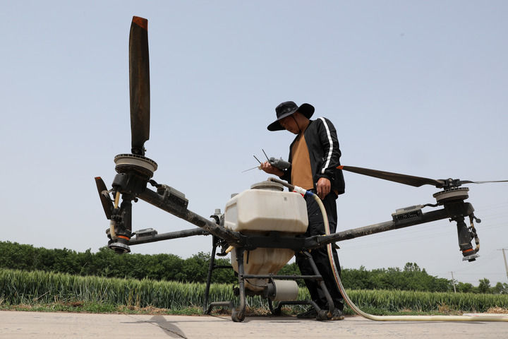 2025年5月7日,在河南省焦作市溫縣祥云鎮(zhèn)古賢村,村民為植保無(wú)人機(jī)添加藥液開(kāi)展“一噴三防”。新華社發(fā)(徐宏星攝)