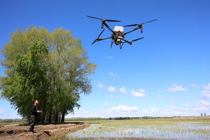 2025年5月21日,在北大荒集團(tuán)黑龍江綏濱農(nóng)場(chǎng)有限公司東井管理區(qū),操作員操控搭載北斗導(dǎo)航系統(tǒng)的植保無(wú)人機(jī),對(duì)即將施返青肥的地塊進(jìn)行打點(diǎn)。新華社發(fā)(李興攝)
