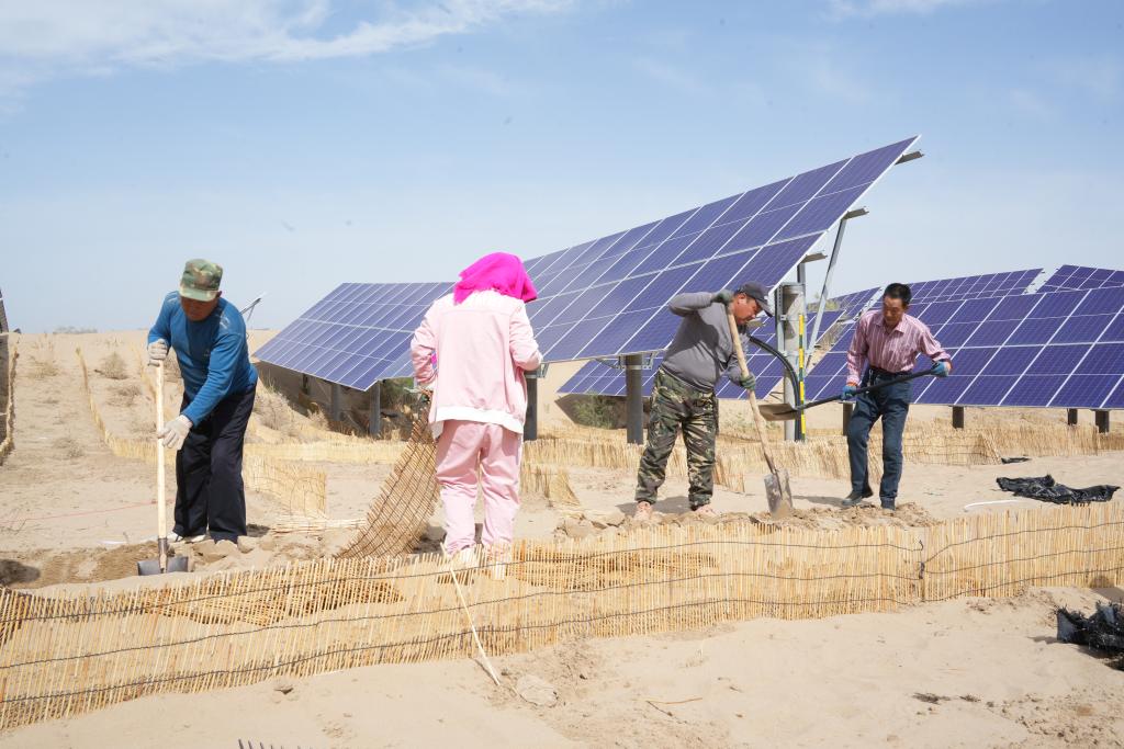 連日來,地處黃河“幾字彎”北岸的巴彥淖爾市臨河區(qū)新華林場光伏治沙項目區(qū)機器轟鳴,新華鎮(zhèn)隆光村村民吳瑞喜和其他村民利用夯土機打地基?!艾F(xiàn)在,我們種的小麥剛抽穗、玉米已澆水,村民們趁著農(nóng)閑到這里打工,一天能掙300元,大家參與防沙治沙的積極性都很高。”吳瑞喜說。