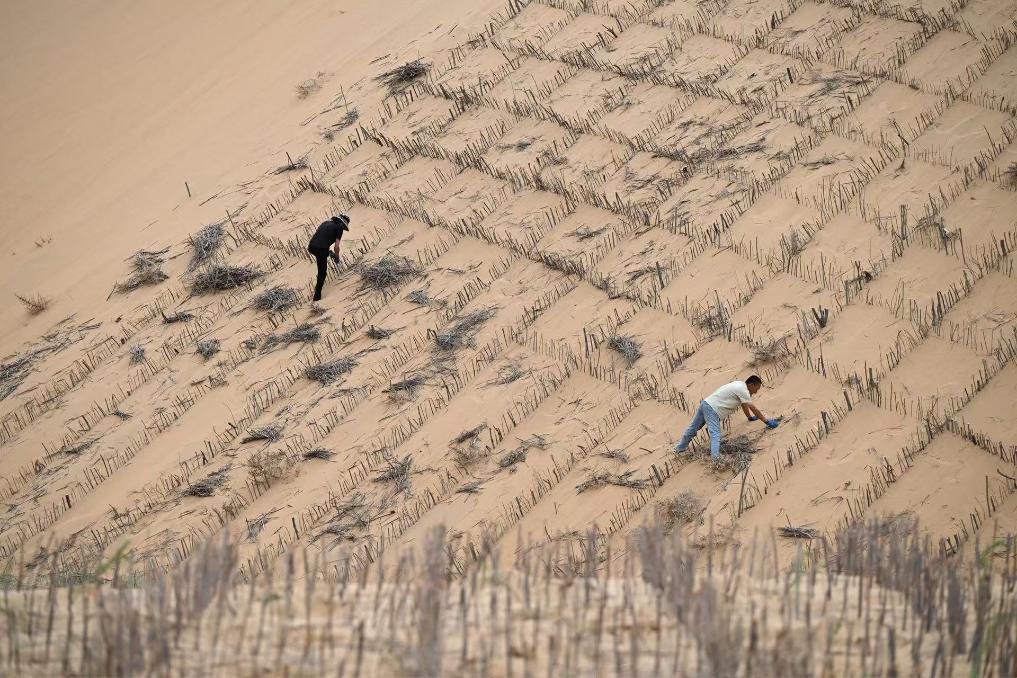 鄂爾多斯市達拉特旗農(nóng)民在防沙治沙項目區(qū)鋪設(shè)沙障。新華社發(fā)(楊耀中 攝)
