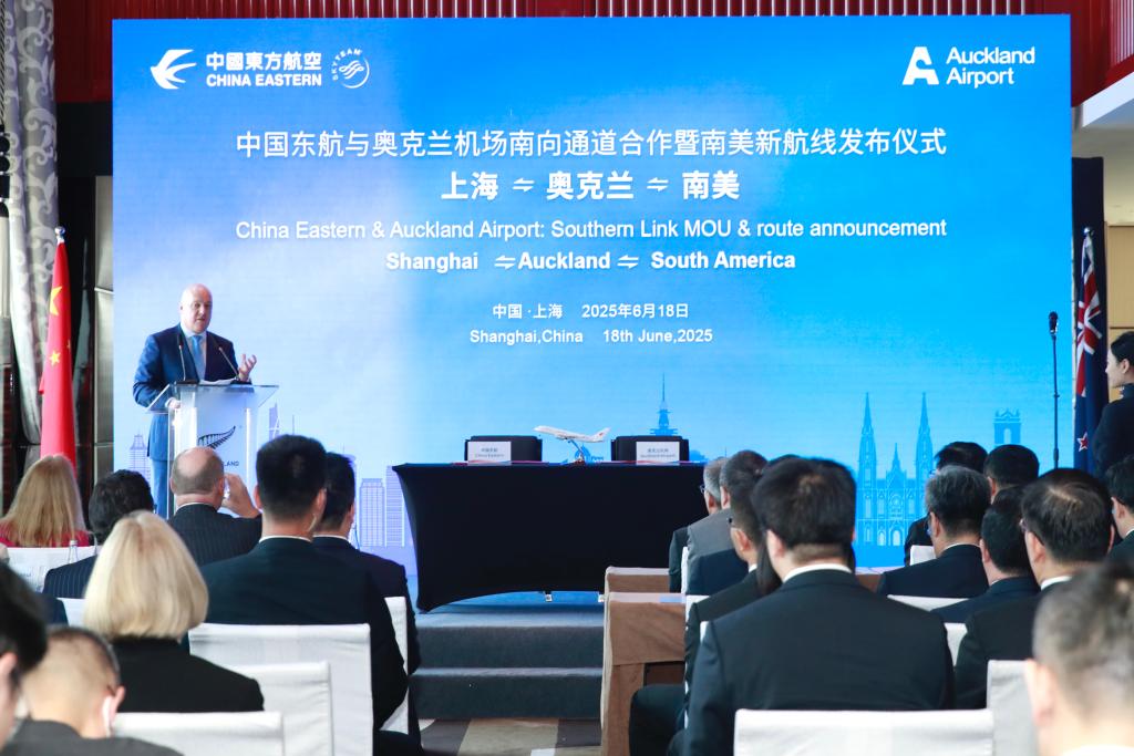 在18日此間舉行的相關儀式上,中國東方航空集團有限公司宣布,將于今年年底前開通上海經新西蘭奧克蘭至阿根廷首都布宜諾斯艾利斯的“南向通道”首條航線。新西蘭方面宣布,將給予通過這條“南向通道”航線中轉的中國旅客免簽證的便利服務,并進一步提升奧克蘭機場的基礎設施條件和服務能力。