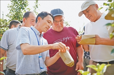 近日,2025年首期中國—中亞五國職業(yè)農(nóng)民培訓(xùn)班在陜西渭南開班。圖為學(xué)員們在西北農(nóng)林科技大學(xué)蘋果試驗(yàn)站了解蘋果套袋知識。
