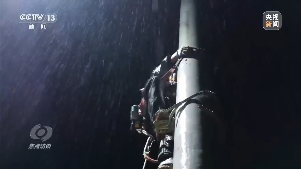 運(yùn)線、接線、試驗(yàn)……雨夜中,隊(duì)員們分工協(xié)作,借助車燈和探照燈的光亮,將一根1100米長(zhǎng)、近4噸重的電纜拉過大橋,沿著公路邊緣一路拉到變壓器旁。大雨中作業(yè),雨水很快就打濕了他們的衣服。為了搶修進(jìn)度,高空作業(yè)人員在電桿上一待就是好幾個(gè)小時(shí)。