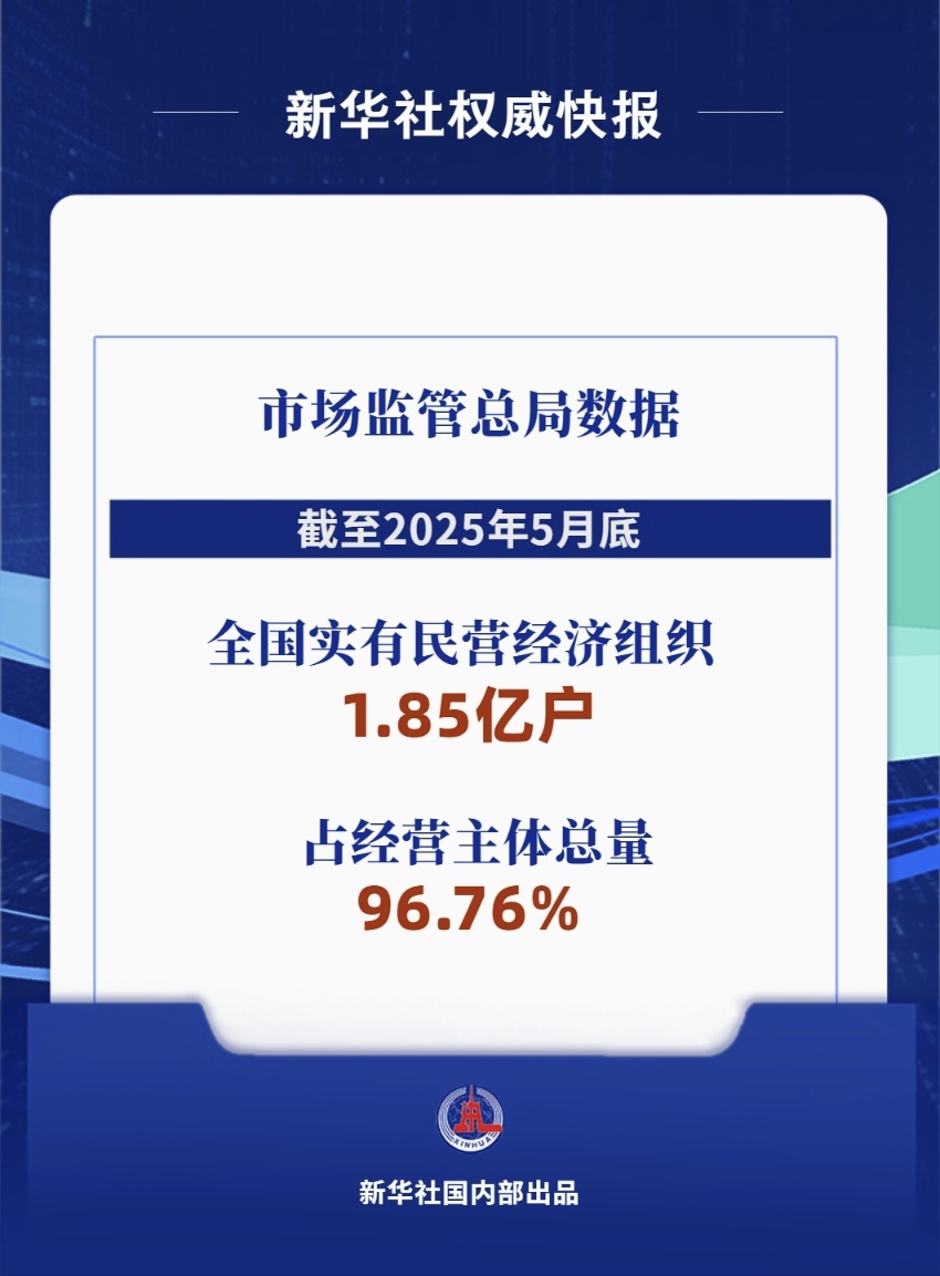 市場監(jiān)管總局數(shù)據(jù)顯示,截至2025年5月底,全國實有民營經(jīng)濟組織1.85億戶,占經(jīng)營主體總量的96.76%,同比增長2.3%。其中,民營企業(yè)數(shù)量突破5800萬戶,同比增長5.2%;個體工商戶達1.27億戶,同比增長1%。