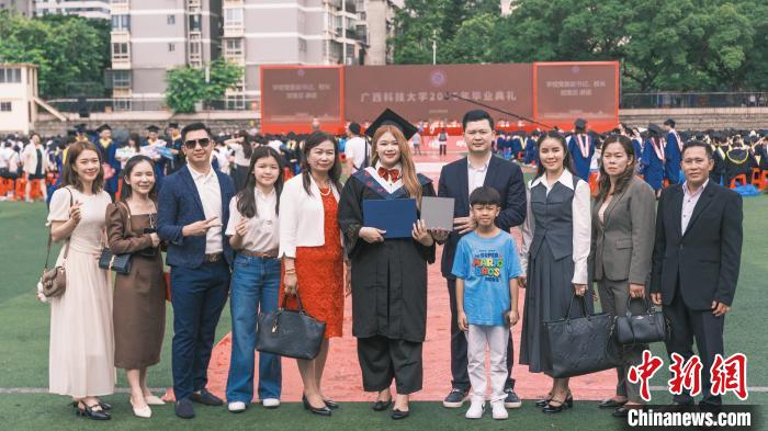 在廣西科技大學(xué)27日舉行的畢業(yè)典禮上,老撾留學(xué)生馬麗文成為全場(chǎng)焦點(diǎn):她的父母、兄弟等十位親人跨國(guó)而來(lái),見證這一重要時(shí)刻。“當(dāng)家人手捧鮮花向我走來(lái),我緊緊擁抱住他們,感謝他們支持我的夢(mèng)想?!瘪R麗文說(shuō)。