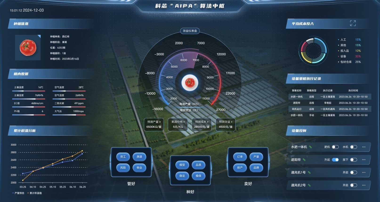 科芯自主研發(fā)的AIPA系統(tǒng),整合了多項(xiàng)新興技術(shù),能夠精準(zhǔn)描述作物的生長(zhǎng)動(dòng)態(tài),并作出生產(chǎn)力預(yù)測(cè)與效益評(píng)估。胡建龍形象地比喻:“這就像是給農(nóng)作物配備了一位24小時(shí)在線(xiàn)的‘智能管家’,它能根據(jù)作物的需求,自動(dòng)調(diào)整灌溉、施肥、遮陽(yáng)等操作,確保作物在最佳環(huán)境中生長(zhǎng)。”