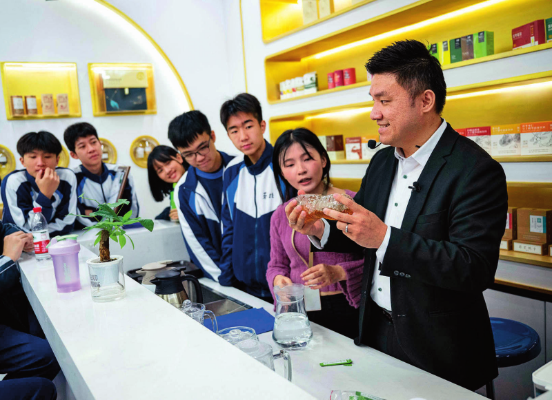 澳門居民黃滋才(右一)在位于橫琴的分子態(tài)(珠海橫琴)中醫(yī)藥健康產(chǎn)業(yè)發(fā)展有限公司的植物(現(xiàn)代中藥)分子博物館內與澳門勞校中學的學生交流(2024年12月11日攝)新華社發(fā)(張金加攝)