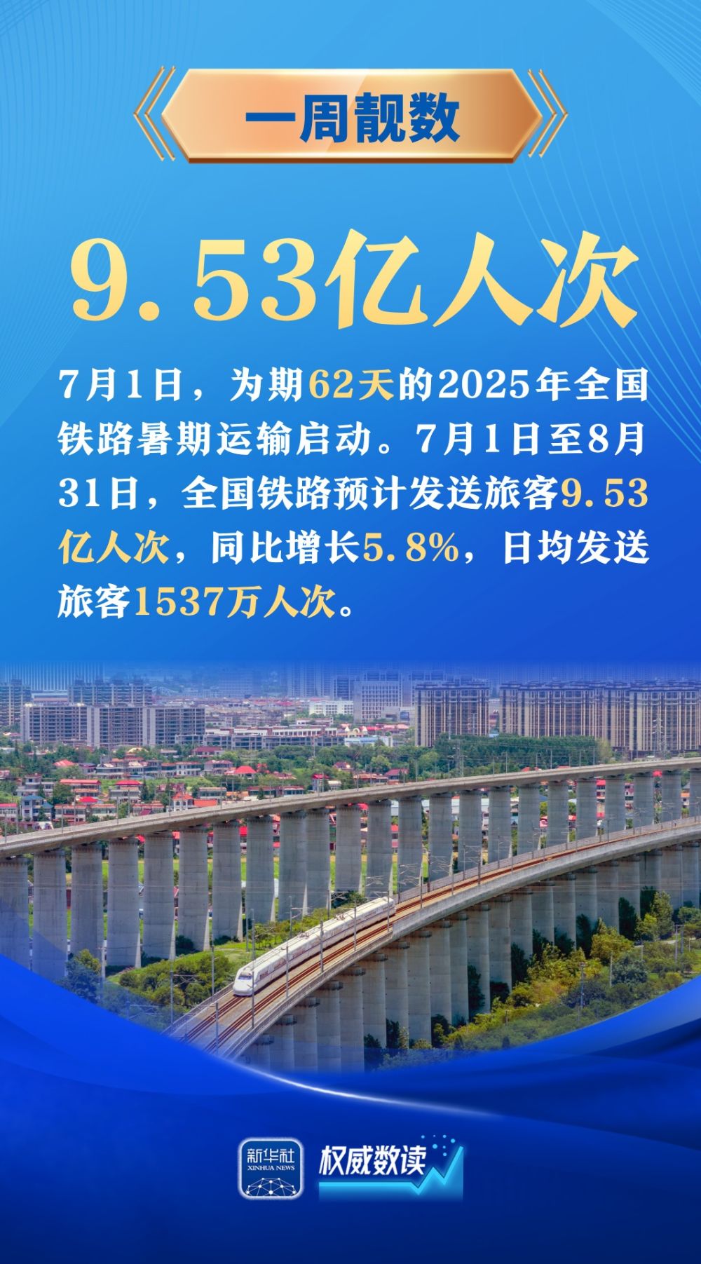 今年“暑運”期間全國鐵路預(yù)計發(fā)送旅客9.53億人次;今年8000億元“兩重”建設(shè)項目清單已全部下達完畢;前5個月我國規(guī)上互聯(lián)網(wǎng)企業(yè)完成互聯(lián)網(wǎng)業(yè)務(wù)收入7735億元……本周這些“靚”數(shù),值得關(guān)注。