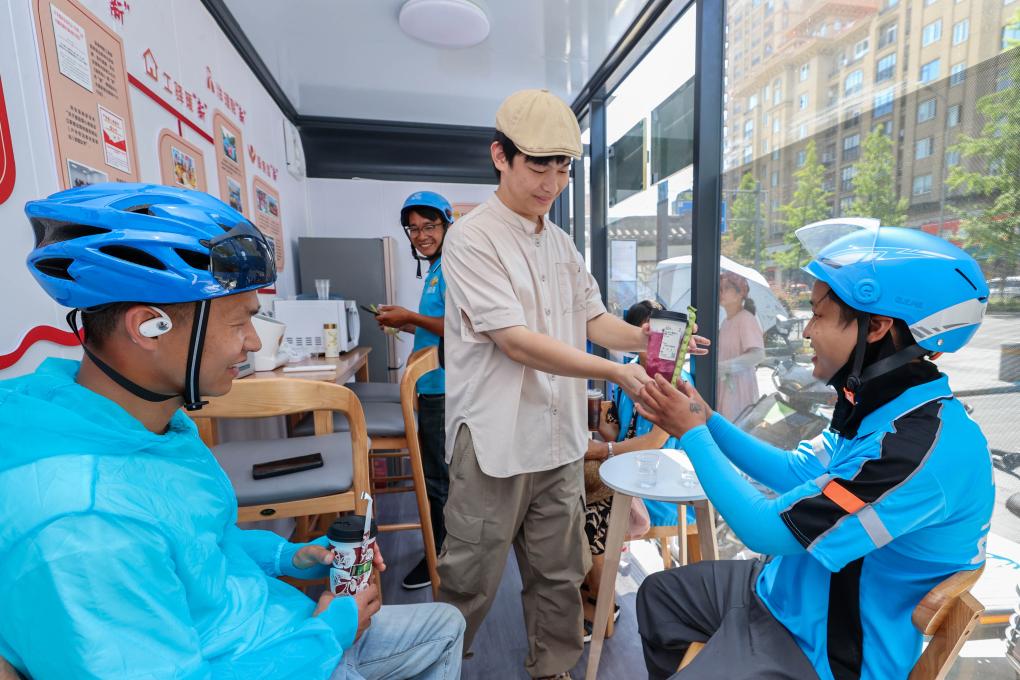 7月2日,在浙江省湖州市德清縣總工會(huì)設(shè)置的工會(huì)驛站里,愛(ài)心商家為外賣小哥送上冷飲。新華社發(fā)(姚海翔攝)