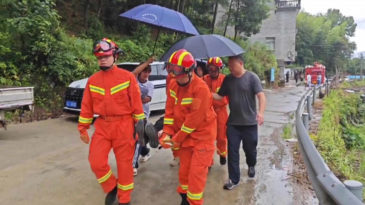 在臺州黃巖嶼頭鄉(xiāng),轉(zhuǎn)移小組在排查中發(fā)現(xiàn)上鳳村一處地質(zhì)災(zāi)害隱患點居住著一位92歲老人,大家立即取來擔(dān)架將老人慢慢抬出。在大家冒雨接力下,老人被護送至安置點。