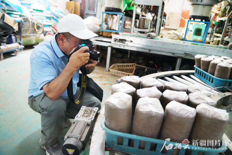 6月30日,在疏勒縣“魯疆情”食用菌生態(tài)科技示范園里,攝影記者約提克爾·尼加提在生產車間拍攝。