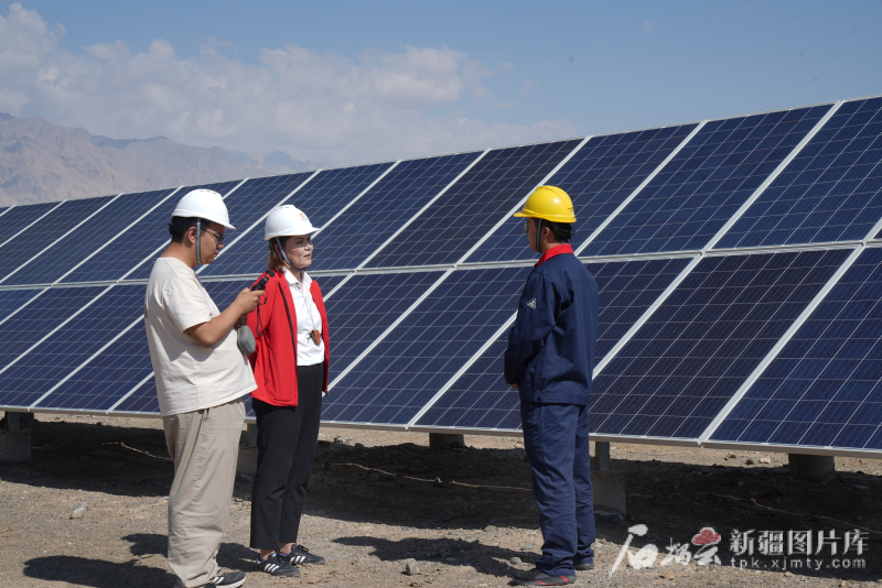 7月3日,在深能福塔光伏電站,記者拍熱扎提·阿不都(中)和馬晉軒(左)了解電站惠及塔什庫爾干塔吉克自治縣百姓的故事。