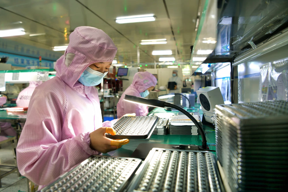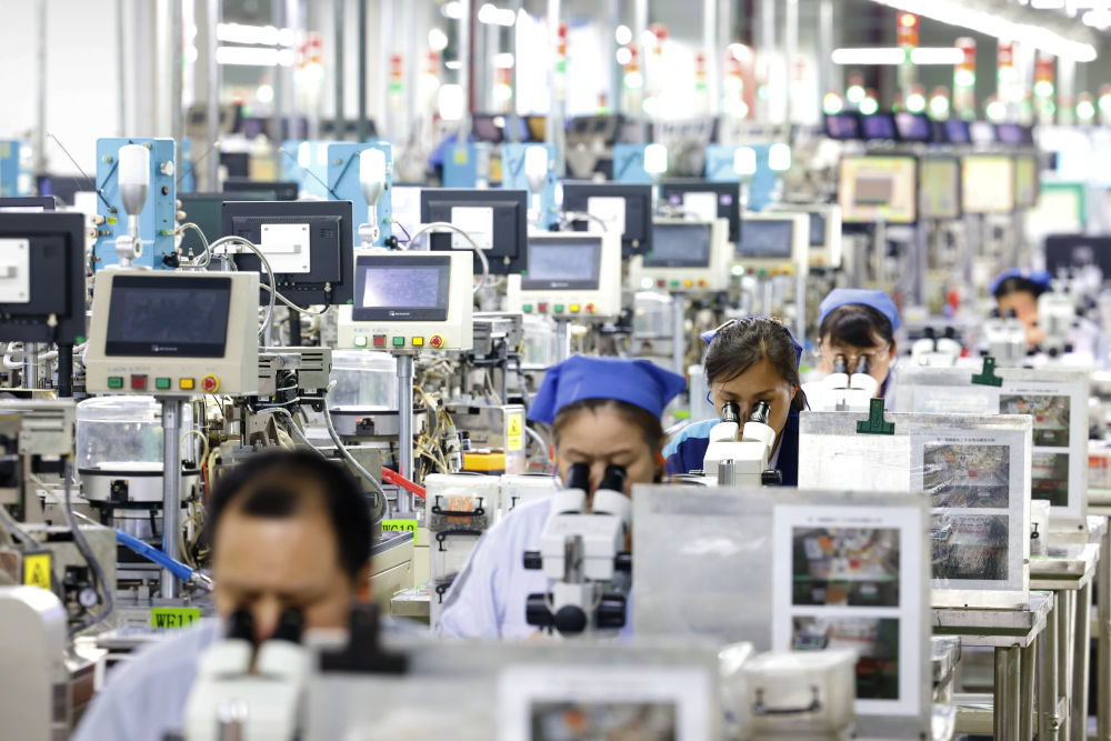 6月24日,在江蘇宿遷泗洪經濟開發(fā)區(qū)慶邦電子元器件(泗洪)有限公司車間內,工人加緊趕制出口的電子訂單產品。新華社發(fā)(許昌亮攝)