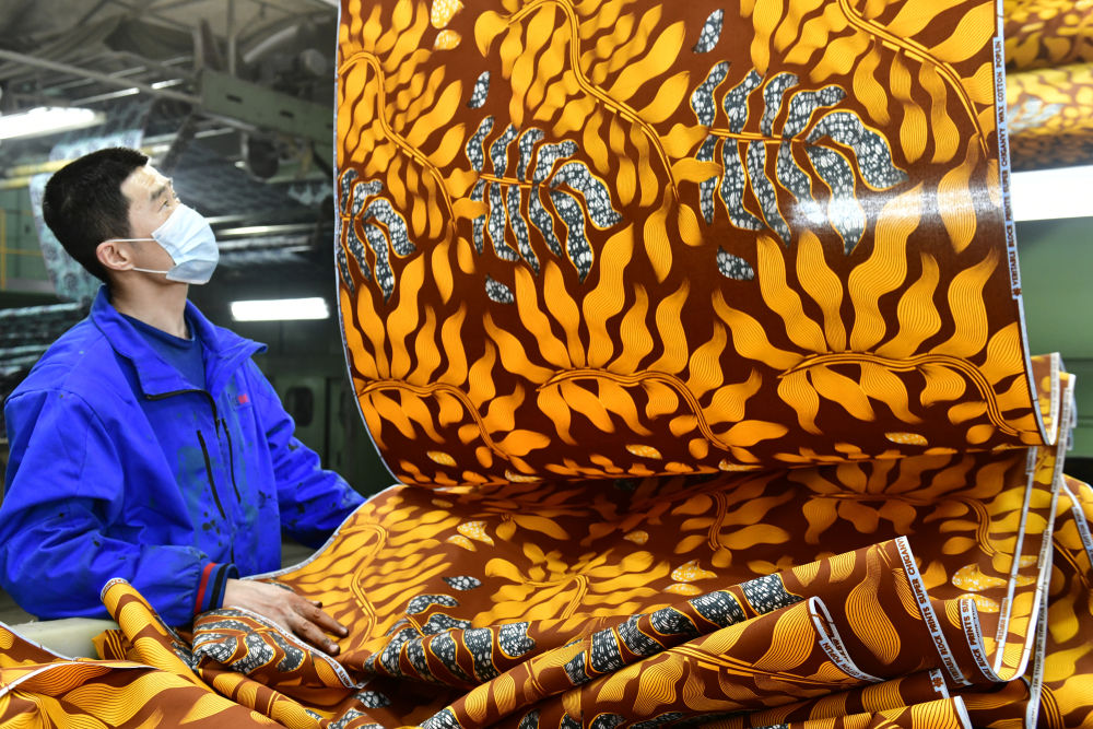 2025年2月25日,在位于山東省濱州市的愉悅家紡有限公司,工作人員在生產出口非洲的布匹。新華社記者 郭緒雷 攝