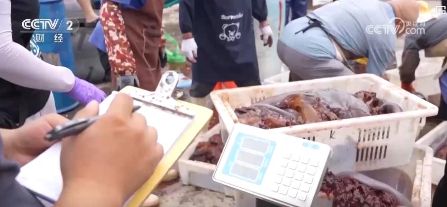 在南漁港碼頭,漁船剛一???,漁民們便爭分奪秒地卸貨、稱重。今年,在煙臺龍口海蜇專項捕撈期,共有41艘漁船成功辦理了海蜇專項捕撈許可證,得以出海作業(yè)。