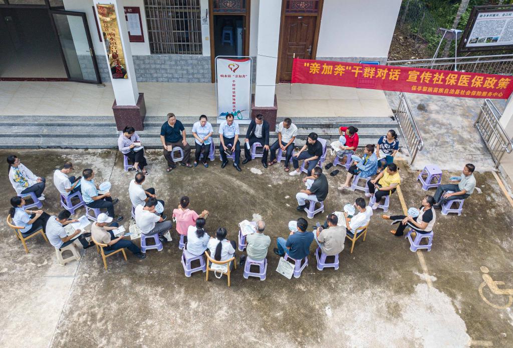 7月16日,在海南省保亭黎族苗族自治縣響水鎮(zhèn)合口村拍攝的“親加奔——干群對話解難題”活動現(xiàn)場(無人機照片)。新華社記者蒲曉旭 攝