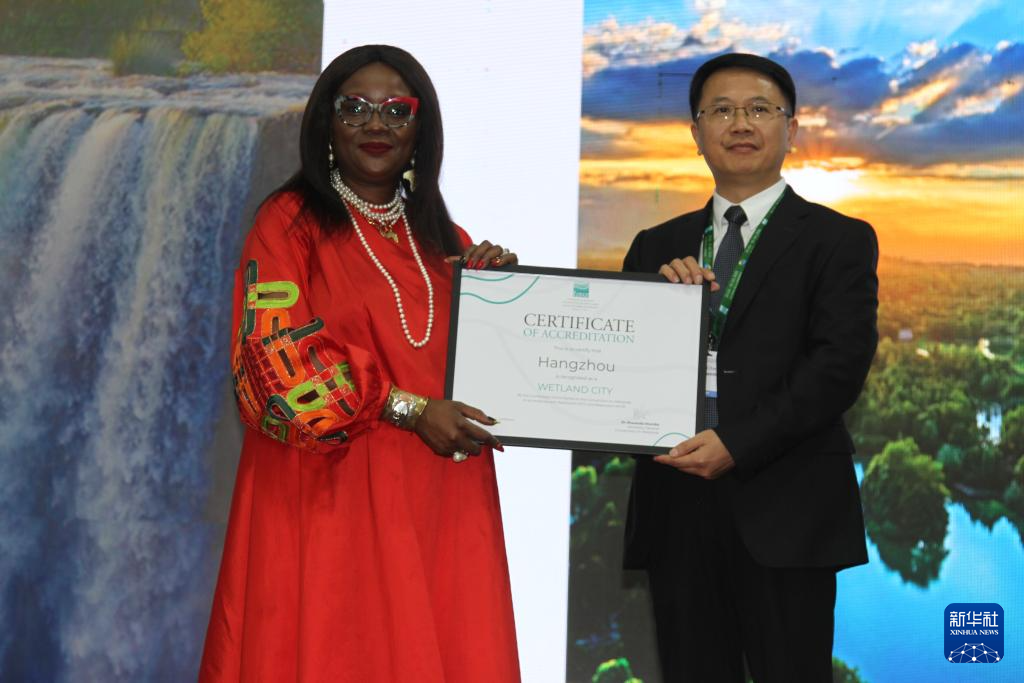 7月24日,在津巴布韋維多利亞瀑布城開(kāi)幕的《濕地公約》第十五屆締約方大會(huì)上,《濕地公約》秘書(shū)長(zhǎng)穆松達(dá)·蒙巴為中國(guó)浙江杭州代表頒發(fā)“國(guó)際濕地城市”證書(shū)。新華社發(fā)(塔法拉攝)