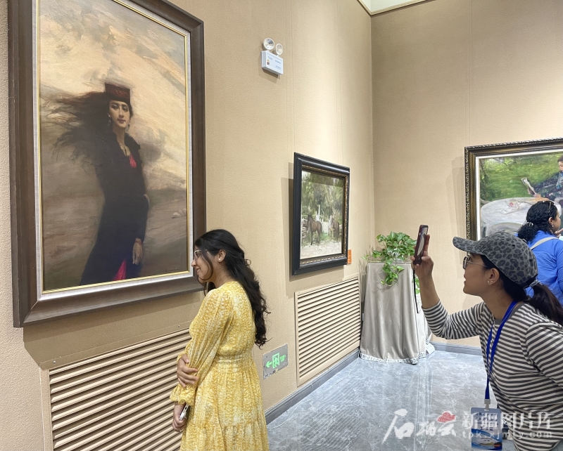 8月2日,北京大學(xué)留學(xué)生在油畫作品前打卡拍照。石榴云/新疆日?qǐng)?bào)記者 趙西婭攝