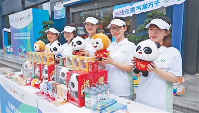 志愿者展示成都世運(yùn)會(huì)文創(chuàng)產(chǎn)品。記者 宋豪新攝