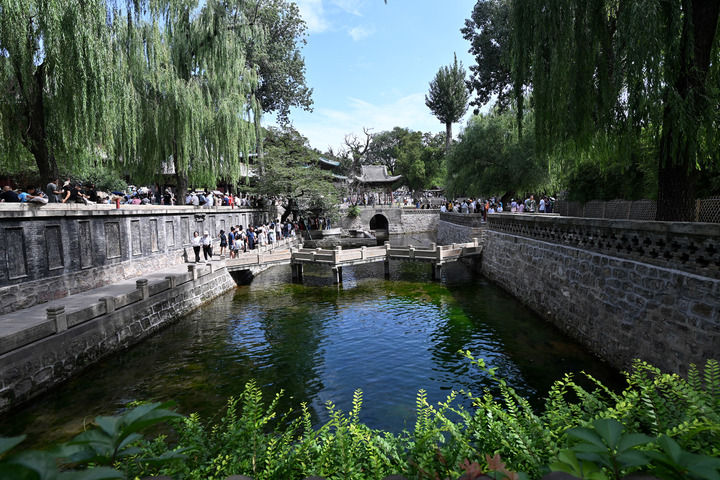2025年8月7日,游客在晉祠難老泉排隊(duì)觀泉。新華社記者 詹彥 攝