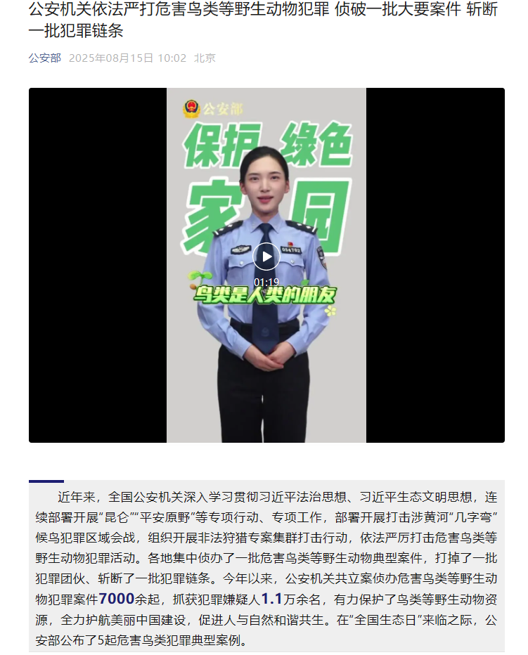 近年來,全國公安機(jī)關(guān)深入學(xué)習(xí)貫徹習(xí)近平法治思想、習(xí)近平生態(tài)文明思想,連續(xù)部署開展“昆侖”“平安原野”等專項行動、專項工作,部署開展打擊涉黃河“幾字彎”候鳥犯罪區(qū)域會戰(zhàn),組織開展非法狩獵專案集群打擊行動,依法嚴(yán)厲打擊危害鳥類等野生動物犯罪活動。各地集中偵辦了一批危害鳥類等野生動物典型案件,打掉了一批犯罪團(tuán)伙、斬斷了一批犯罪鏈條。今年以來,公安機(jī)關(guān)共立案偵辦危害鳥類等野生動物犯罪案件7000余起,抓獲犯罪嫌疑人1.1萬余名,有力保護(hù)了鳥類等野生動物資源,全力護(hù)航美麗中國建設(shè),促進(jìn)人與自然和諧共生。在“全國生態(tài)日”來臨之際,公安部公布了5起危害鳥類犯罪典型案例。
