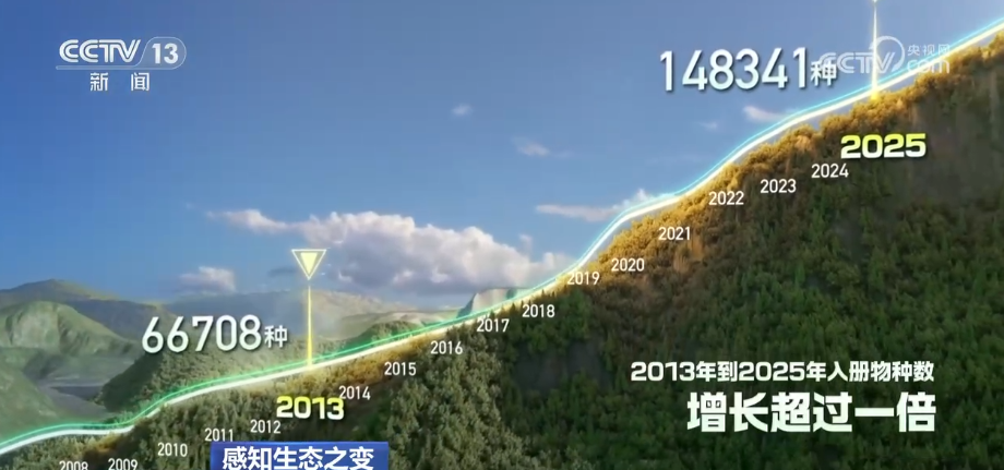 如今,《中國生物物種名錄》上“入冊(cè)”的生物種數(shù),從2013年的6.7萬種增長到2025年的14.8萬種,增長超過一倍。近500種野生動(dòng)植物的受威脅等級(jí)出現(xiàn)下降。