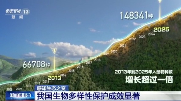 如今,《中國(guó)生物物種名錄》上“入冊(cè)”的生物種數(shù),從2013年的6.7萬(wàn)種,增長(zhǎng)到2025年的14.8萬(wàn)種,增長(zhǎng)超過(guò)1倍。近500種野生動(dòng)植物的受威脅等級(jí)出現(xiàn)下降。