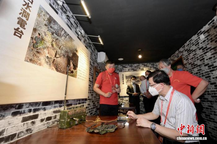 2022年9月3日,香港特區(qū)行政長官李家超(右一)出席香港沙頭角抗戰(zhàn)紀(jì)念館揭幕典禮時(shí),在紀(jì)念館“石水澗電臺(tái)”展區(qū)體驗(yàn)抗戰(zhàn)時(shí)期電臺(tái)工作。(資料圖)(香港特區(qū)政府新聞處供圖)
