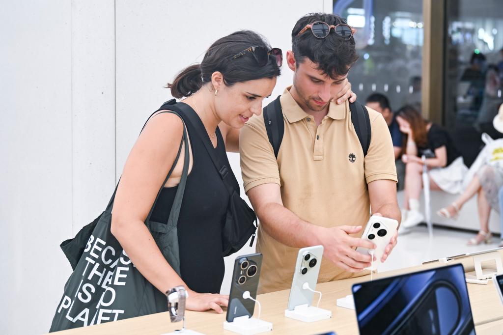 7月17日,兩名西班牙游客在位于上海市南京路步行街的華為商店里瀏覽手機產品。新華社記者 陳浩明 攝